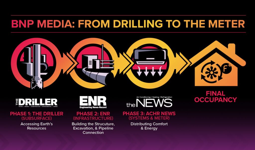 The Driller audience focuses on discovering and developing thermal energy resources at the source. ENR reaches the engineers and construction leaders who design and build the pipelines and infrastructure that move that energy where it needs to go. The NEWS engages the contractors and system professionals who convert thermal energy into practical heating and cooling solutions within buildings.